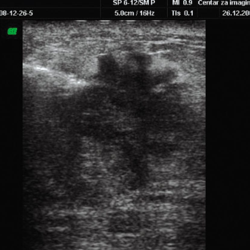 For the sake of more reliable findings and a better outcome for the patient, teamwork is always necessary, it is necessary for the radiologist and the pathologist to cooperate and exchange opinions on a daily basis. If there is a discrepancy between the radiological and pathological, as well as the clinical findings, there are two ways to arrive at an adequate diagnosis: either to repeat the biopsy in an identical manner, as the initial one, or biopsy with the use of a needle of a larger diameter (thicker needle). It is usual that after a core biopsy, VAB is performed in the next intervention, or (which depends primarily on the pathologist’s findings) the change is surgically excised, in order to evaluate it as a whole. There are also cases when after a biopsy with a thick needle, bearing in mind the benign histological findings, we opt for radiological monitoring. In such cases, the patient is followed by the first radiological control in 6 months. Such an approach is applied if it is a change in the breast that has grown relatively quickly, and has a benign radiological, ultrasound aspect, with a histopathological finding that it is a fibroadenoma. In that case, we consider the change to be definitely benign, but its faster growth indicates the need for ultrasound control in 6 months.