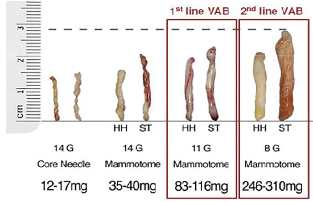 Today, both types of biopsies are used equally, with a tendency to use VAB more often due to the larger amount of material obtained and thus more reliable histological diagnosis.